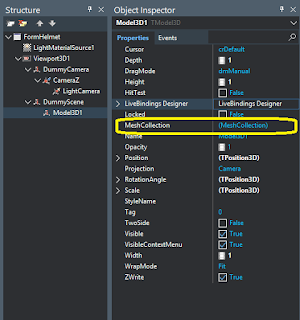 El componente tModel3D (Model3D1) deberá colgar de un tDummy (DummyScene) y el objeto de malla en formato OBJ lo tendremos que indicar desde la propiedad MeshCollection (lo indico en color amarillo en la imagen superior).